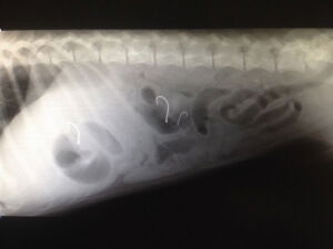 בבדיקה הקלינית בבית החולים הוטרינרי נראה גברי מיובש, עייף ובמישוש בטני הורגש כאב חד בבטן ולכן נעשה מיד צילום רנטגן אשר הראה 3 קרסי דייג , אחד הקרסים בקיבה ושני קרסים נוספים במעי.